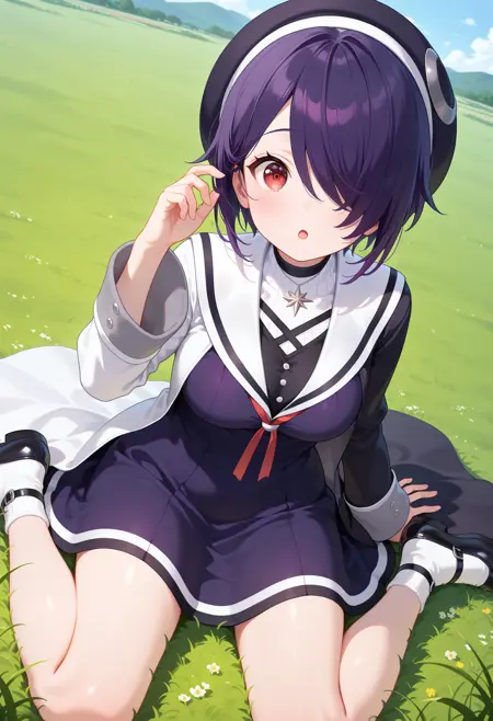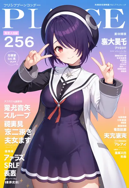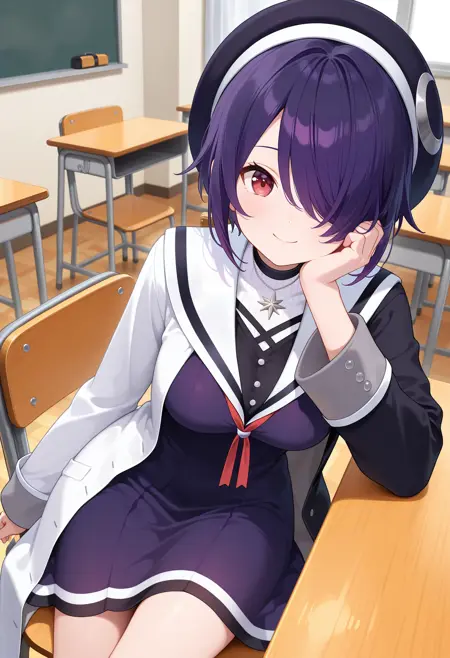 outfit1aatamako, short hair, purple hair, beret, black headwear, hair over one eye, necklace, school uniform, white sailor collar, sailor dress, purple dress, coat, split-color clothes, long sleeves