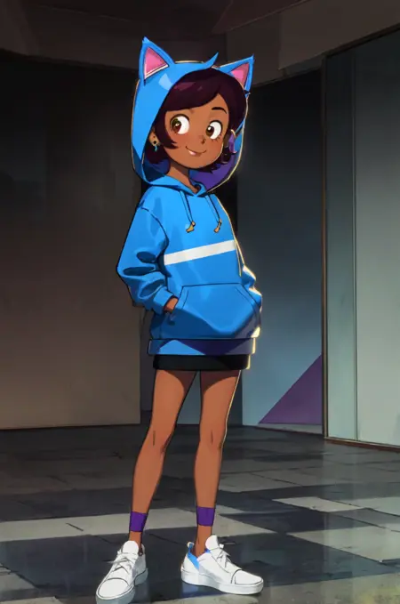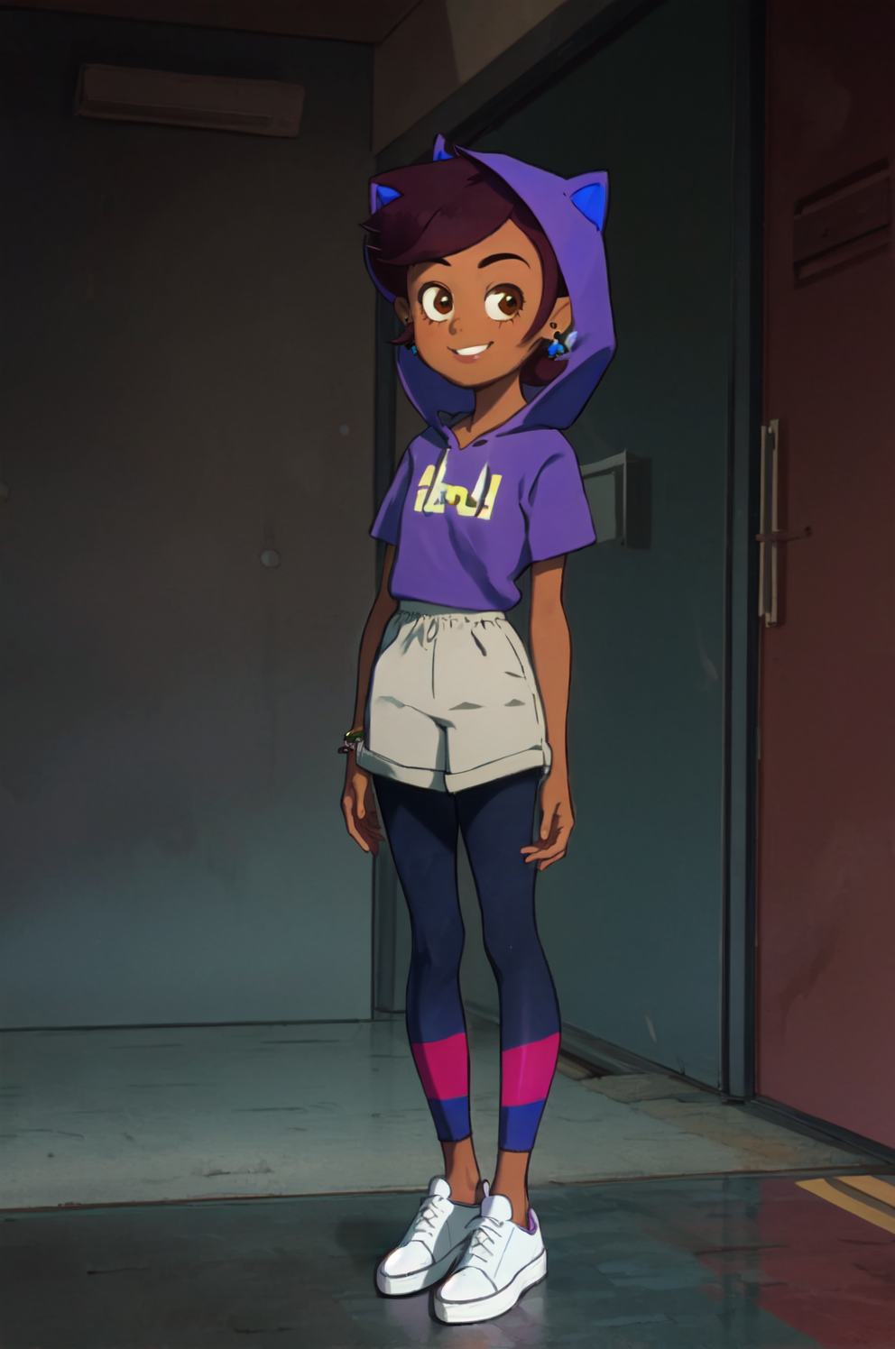 normal outfit: Luz_Noceda, flat chest, looking at viewer, smile, short hair, brown hair, brown eyes, jewelry, standing, full body, purple hair, earrings, shoes, shorts, dark skin, cape, white footwear, black background, leggings