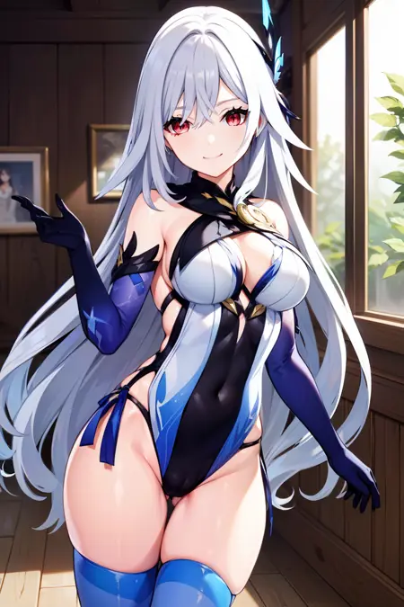 触发词: SkirkGI, 红眼睛, 长发, 白发, 蓝发, 发饰, 中等胸部, 裸露肩膀, 白色连衣裙, 黑色短裤, 肘部手套, 大腿靴, 高跟鞋