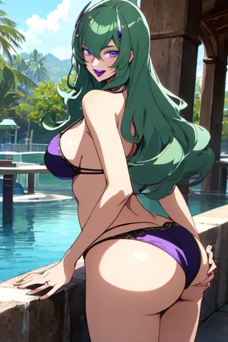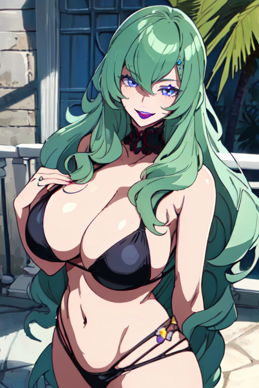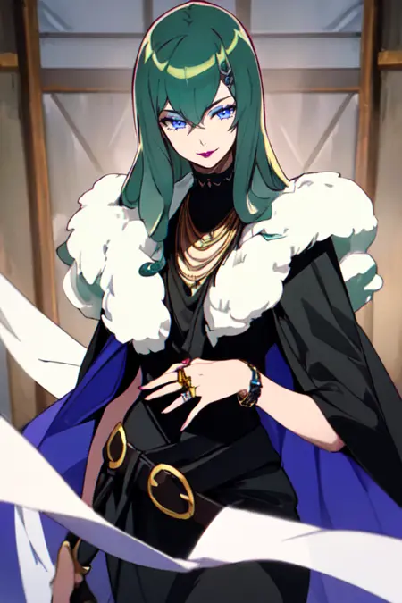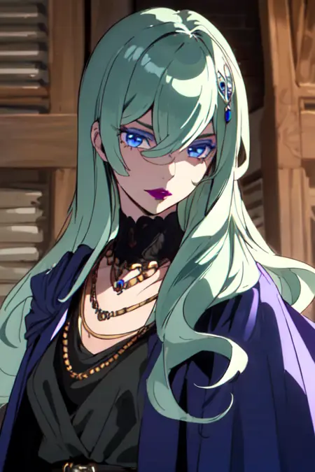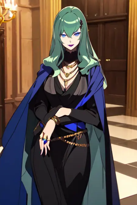 プロンプト: masterpiece, best quality, high quality details,1girl, solo, long hair,green hair, blue eyes, dark lipstick, makeup, wide hips, long black dress, bluish cape, jewelry, accessories, rings, necklaces, ornamental belts, Wedding Hair