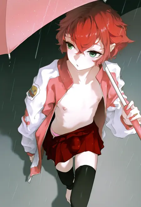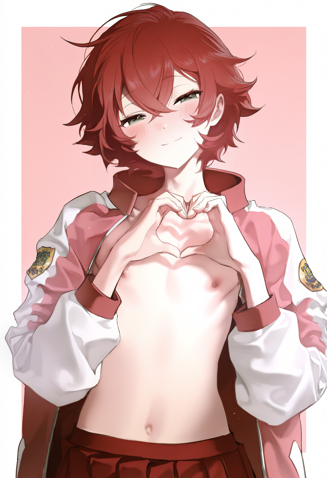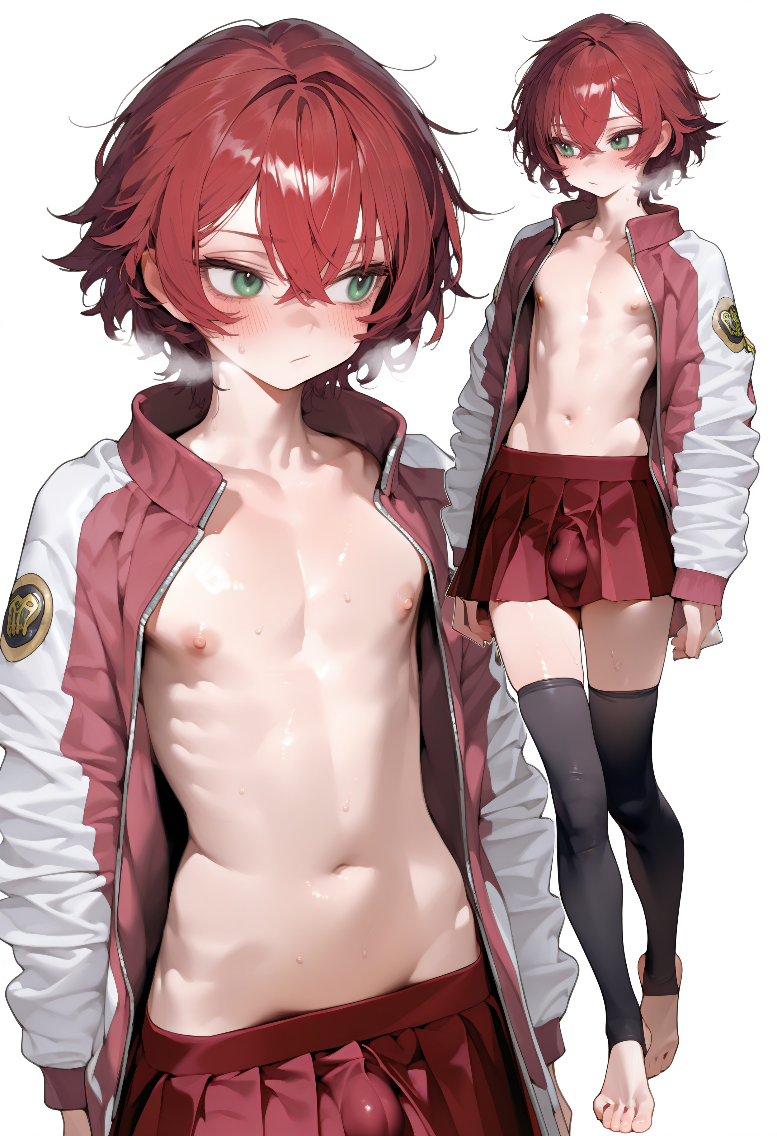 トリガーワード: hotaruchar, otoko no ko, 1boy, open jacket, red hair, nipples, black thighhighs, green eyes, pleated skirt, barefoot, crossdressing, short hair, open clothes, multicolored jacket, hair between eyes, red jacket, long sleeves, letterman jacket, red skirt, two-tone jacket, toeless legwear, stirrup legwear, crossed bangs, sukajan, naked jacket