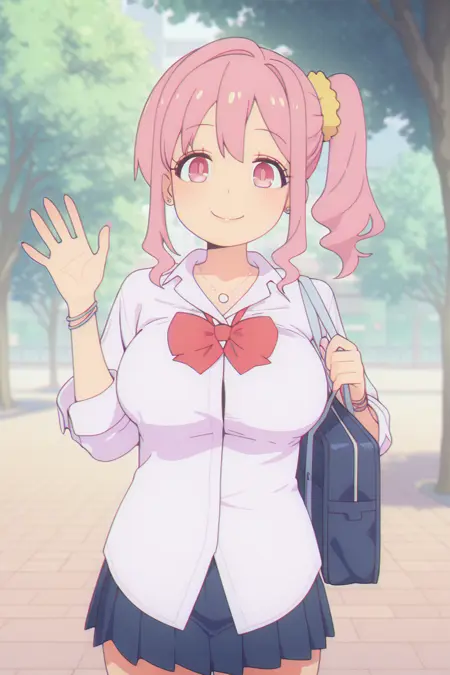 kaedehozuki, 1girl, solo, red bow, skirt, shirt, bow, pink hair, jewelry, side ponytail, school uniform, yellow scrunchie, waving, white shirt, pleated skirt, pink eyes, necklace, sidelocks, bowtie, dfltsk