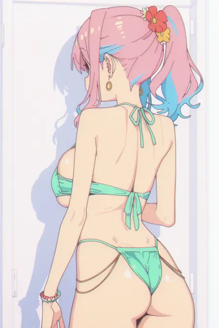 kaedehozuki, 1girl, swimsuit, breasts, bikini, pink hair, solo, eyewear on head, pink eyes, heart, jewelry, heart-shaped eyewear, flower, navel, hair flower, hair ornament, sunglasses, multicolored hair, large breasts, green bikini, bracelet, looking at viewer, pink nails, bknsk