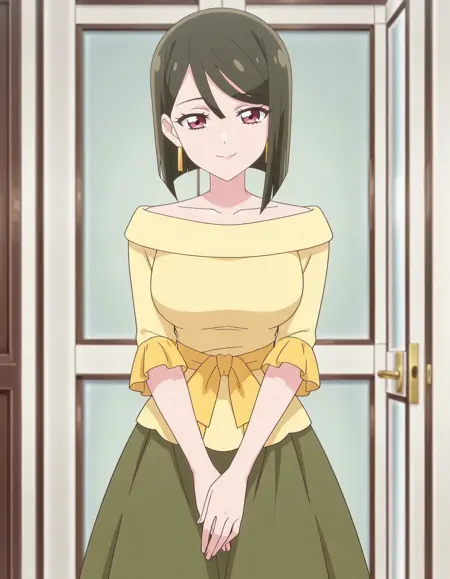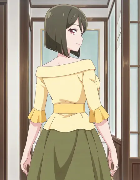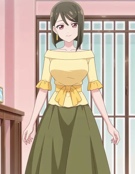 anime screencap, solo,1girl,nekoyashikisumire, green skirt,off-shoulder shirt, yellow shirt,lora:nekoyashikisumire_IL:0.8 high definition,amazing quality,best quality,very aesthetic,masterpiece,absurdres,