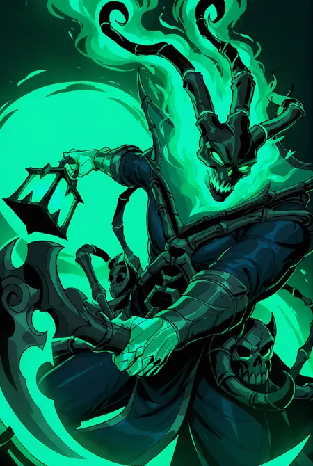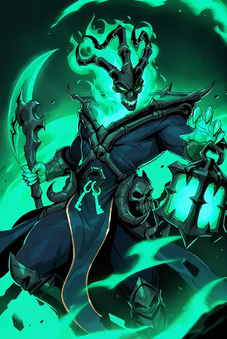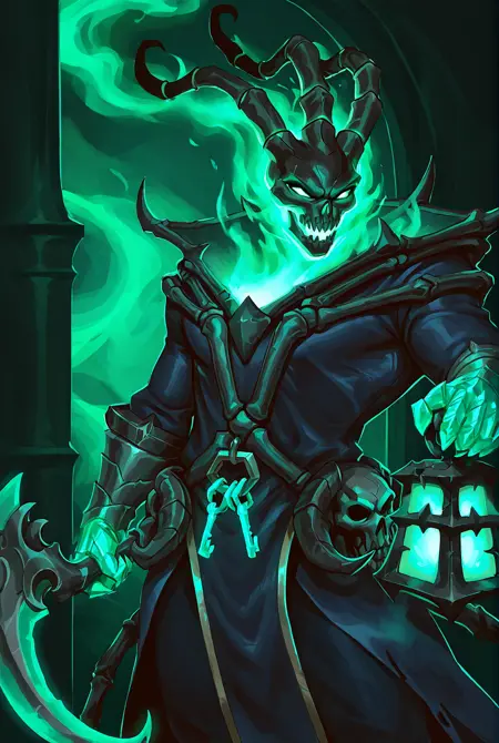 thresh \(league of legends\), thr3sh,demon, skull, glowing eyes, green fire, fire, teeth, horns, armor,