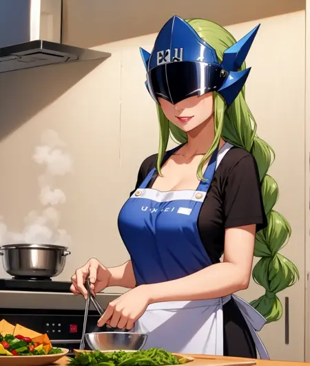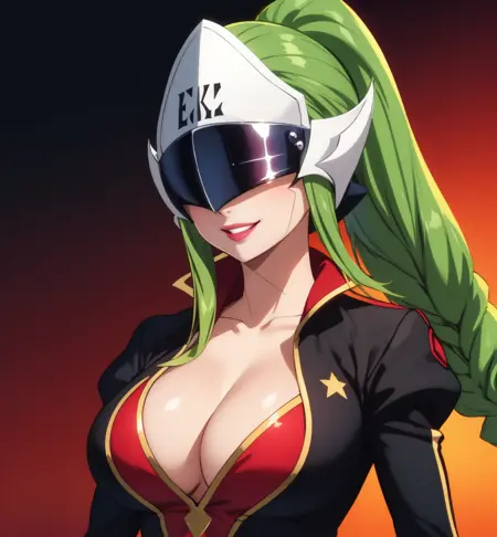 "witchbattledress" generally generates the helmet + visor look. Add "combat visor, combat helmet, concealed eyes" to help with achieving said look.
