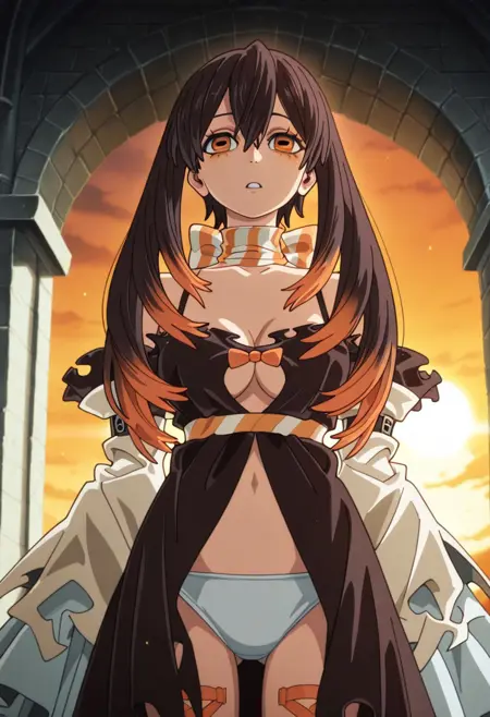 줄무늬 띠, 열린 드레스, 배꼽, 넓은 소매, 흰색 소매, 찢어진 소매, 팔 벨트, 소매가 손목을 넘음, 흰색 팬티,
