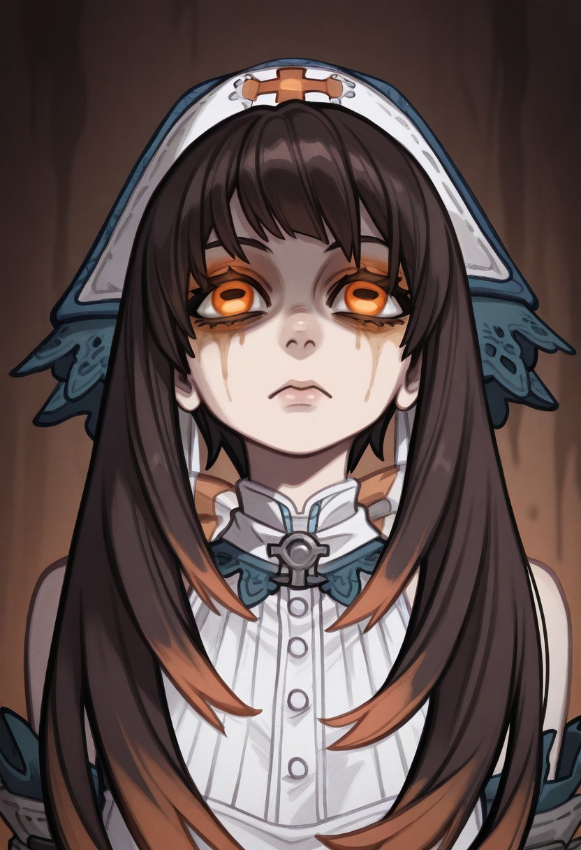 진한 갈색 로인클로스 드레스, 가슴 절개, 주황색 bow, 분리된 소매, 헤어진 망토 끝,