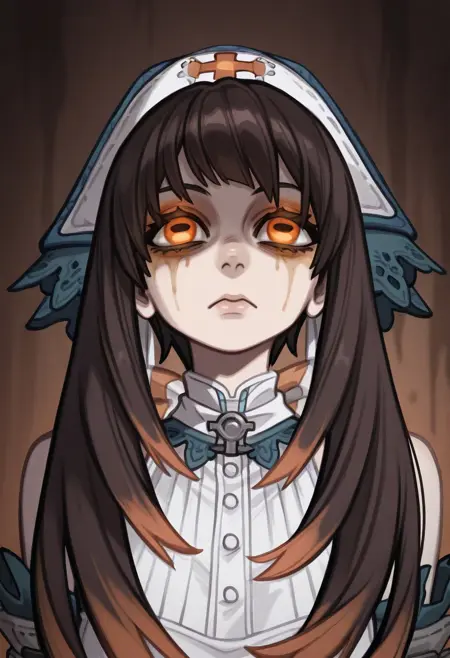 간호사 캡, 높은 칼라, 흰색 드레스, 소매 없는 드레스, 슬릿 드레스, 깊은 V넥, 무늬 장식, 짧은 드레스, 십자가 문양, 무늬 장식, 파란색 레이스 장식, 파란색 자수, 화려한 장식, 어깨 망토,