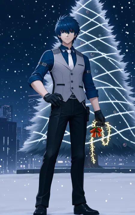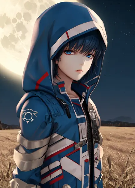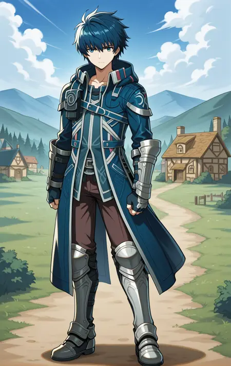 服装使用:蓝色外套、兜帽、蓝色手套、露指手套、棕色长裤、黑色衬衫、银色鞋子。使用带兜帽和不带兜帽的提示可控制兜帽的开合。