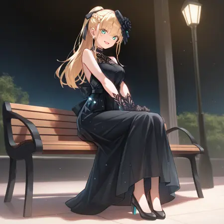 TojoTsukasa, Tjt_3rd, 金发, 水蓝色眼睛, 法式辫子, 长发, 白色丝带, 头饰丝带, 衬衫, 替代白色衬衫, 黑色领带, 黑色西装, 黑色夹克, 有领夹克, 黑色袖子, 黑色长裤, 西装裤套装, 黑色鞋履, 高跟鞋,