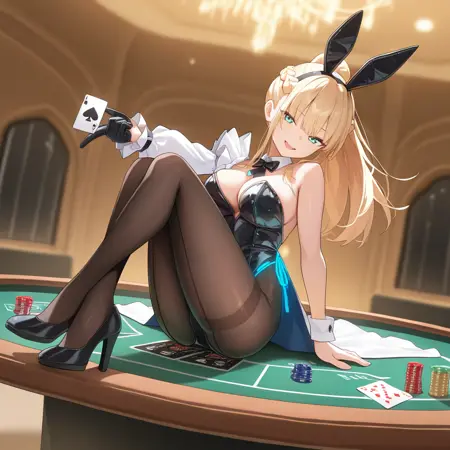 TojoTsukasa, Tjt_4th, 金发, 水蓝色眼睛, 法式辫子, 长发, 高马尾, 不对称袖子, 荷叶边袖子, 白色袖子, 宽袖, 腰部斗篷, 毛皮镶边, 肩带, 单侧裸露肩膀, 脱落袖子, 脱落衣领, 黑色蝴蝶结, 女郎兔装, 兔耳发带, 黑色发带, 黑色紧身衣, 无肩带紧身衣, 替代棕色连裤袜, 连裤袜, 大腿带连裤袜, 荧光镶边, 黑色手套, 半指手套, 单侧腕带,