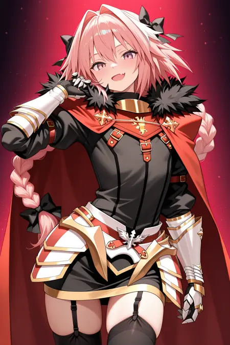 astolfo \(fate\), fate \(series\), 1boy, astolfo \(third ascension\) \(fate\), fur-trimmed cape, gauntlets, black garter straps, red cape, black thighhighs, black bow, braid, hair intakes, skin fang