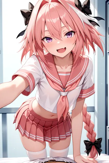 astolfo \(fate\), astolfo \(sailor paladin) (fate\), fate \(series\), 1boy, fang, purple eyes, hair between eyes, pink hair, long hair, streaked hair, white hair, very long hair, single braid, hair intakes, hair bow, hair ribbon, navel, serafuku, serafuku, white thighhighs, pleated skirt, white shirt, red skirt, pink skirt