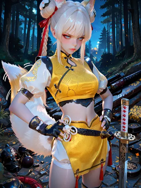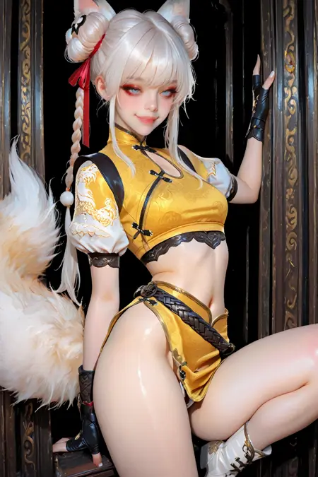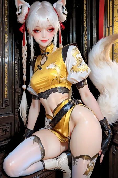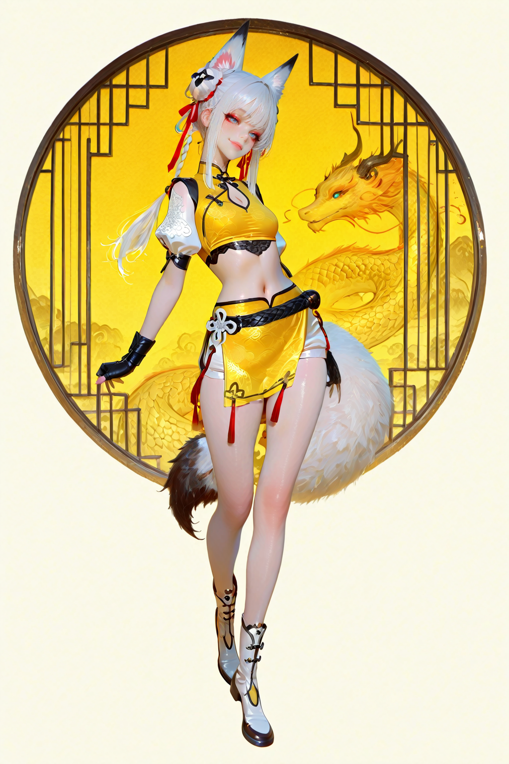 トリガー語(Trigger word)****: crop top,中国風の服,黄色の服,白いブーツ,短い袖,腹部露出,ふくらはぎ袖,ベルト,衣装のカットアウト,(ドラゴンプリント:0.8),フィンガーレスグローブ,ミニスカート,