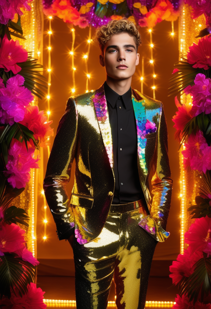 これは、輝くハロー、きらめくグリッター、豊かな花々、超高濃度の色調で、生きているようなアイコンのように描かれた成人男性の印象的な画像を生成します。