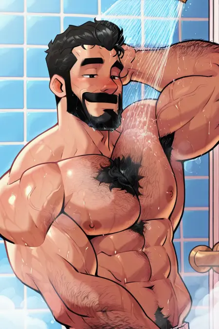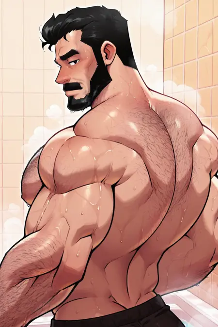 提示词:Jud3D3vir、bara、男性焦点、1个男孩、单独、黑发、面部毛发、胡须、八字胡、黑眼睛、肌肉发达、大胸肌、粗壮手臂