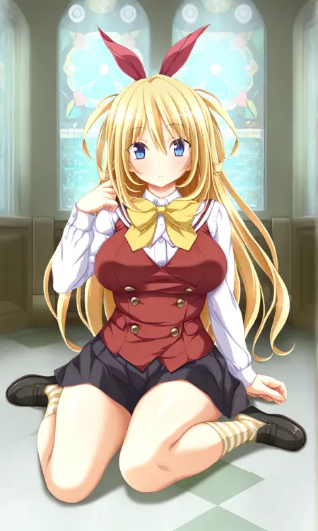 유니폼: riz mathers, 긴 머리, 금발, 헤어 리본, 파란 눈, 학교 유니폼, 넥타이, 노란색 넥타이, 붉은갈색 조끼, 흰색 블라우스, 검정 치마, 미니 치마, 흰색과 연주황색 줄무늬 양말, 검정 구두, 곡선이 아름다운,