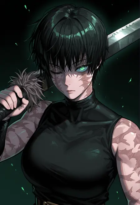 プロンプト: makiil, 短い髪, 1人の少女, 緑の目, 黒髪, 刃傷,