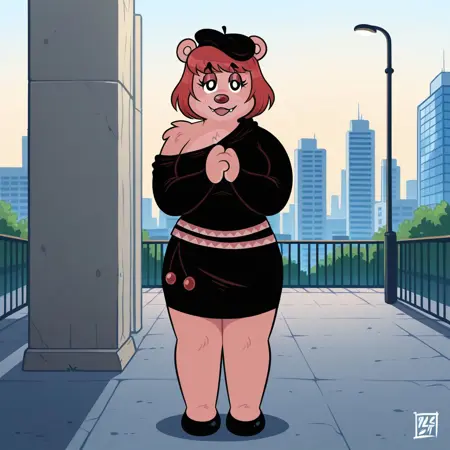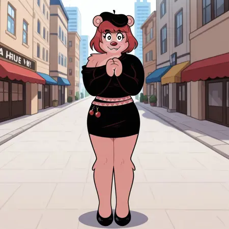 bear, bear girl, pink fur, red hair, bangs, black eyes, red nose, fangs, bear ears, black beret, black shirt, off shoulder, pencil skirt, belt, black slip on shoes,