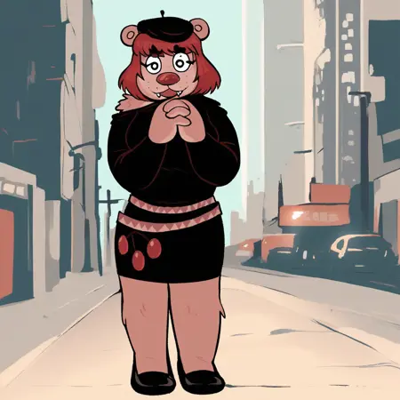 bear, bear girl, pink fur, red hair, bangs, black eyes, red nose, fangs, bear ears, black beret, black shirt, off shoulder, pencil skirt, belt, black slip on shoes,