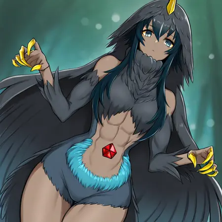 ReBemstarMS, 1girl, solo, monster girl, personification, harpy, dark skin, dark-skinned female, long straight dark blue hair, bangs, hood, golden horn, large turquoise eyes, black feathers crop top with tight fitting chest, large breasts, midriff, groin, black short shorts, tight-fitting at the hips, blue fur trim, wide hips, long black tail with a yellow pointed tip, dark blue feathers cloak, golden yellow knee high boots, golden claws, gem, detached sleeves, feathers, bare shoulders,