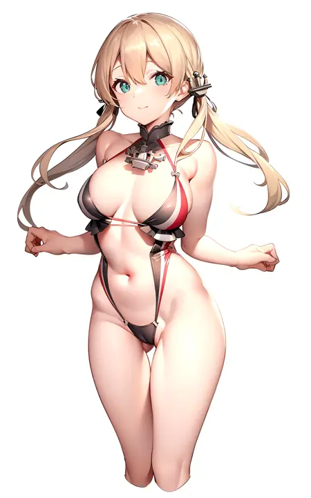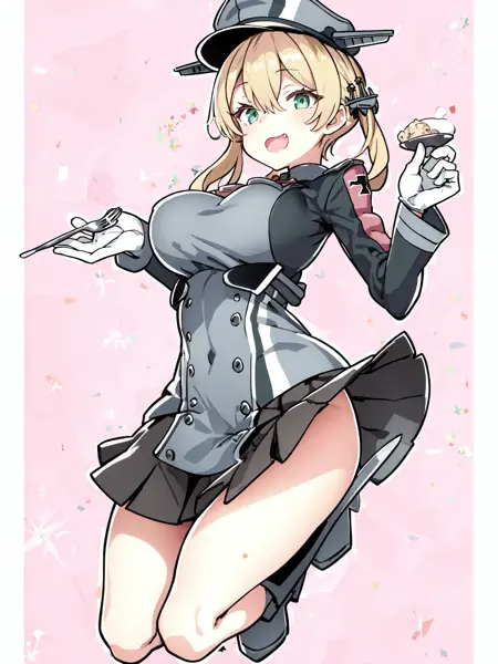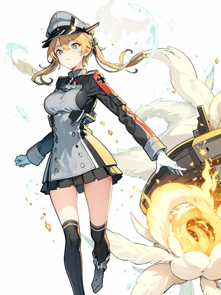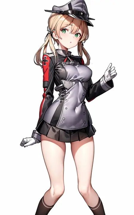 Official Outfit: anchor hair ornament, peaked cap, hat ornament, military uniform, iron cross, long sleeves, white gloves, black skirt, pleated skirt, miniskirt, kneehighs, boots,