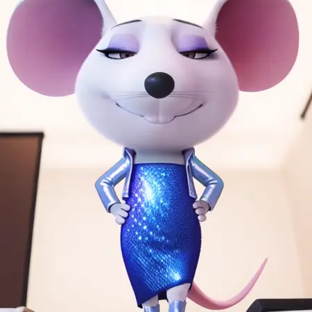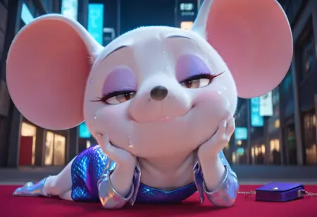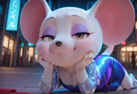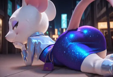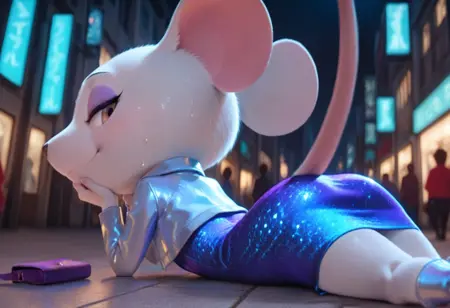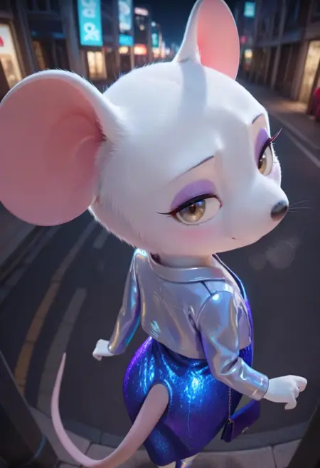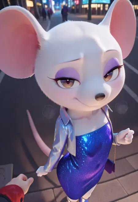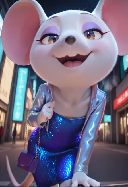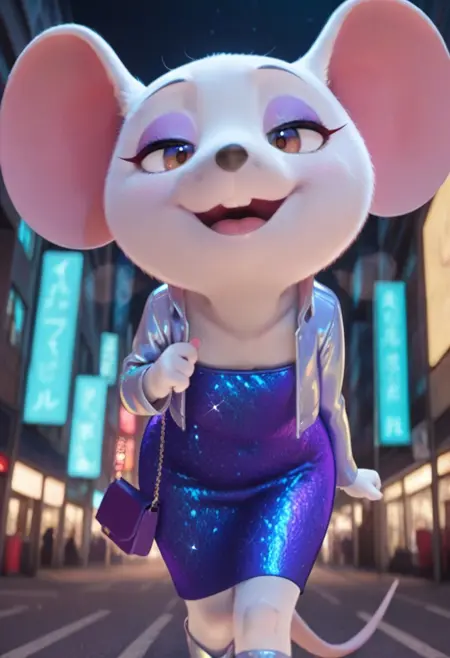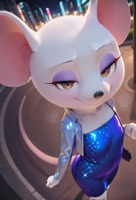 NancySing, furry female, female, mouse girl, animal ears, mouse ears, purple makeup, brown eyes, blue dress, sparkling dress, silver jacket, reflective jacket, silver boots,