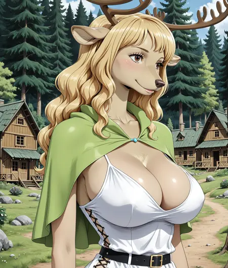 | 训练词汇 | milky_deer, blonde hair, deer ears, deer antlers, furry, long hair, wavy hair, milky_hairstyle, brown eyes, large breasts, narrow waist,已复制! toon (style), flat color, one_piece_style, original,已复制! green cape, white dress, cleavage, short dress, milky_outfit, laced sides, original, black belt,已复制! pink footwear, thigh boots, high heels已复制! |