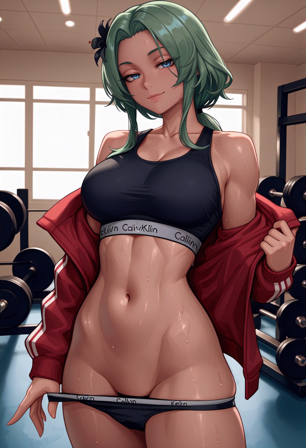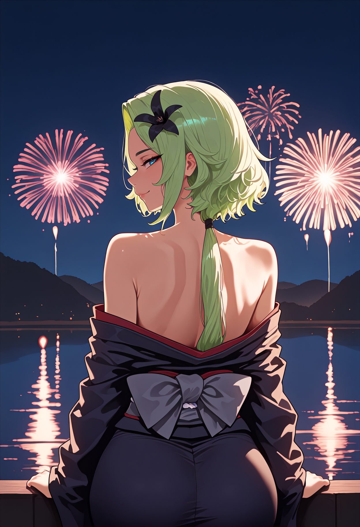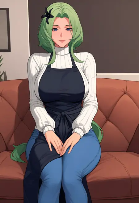 외모: 눈 밑 주근깨, 매우 긴 머리카락, 녹색 머리카락, 낮은 꼬리, 머리카락 장식, 검은 꽃, 파란 눈