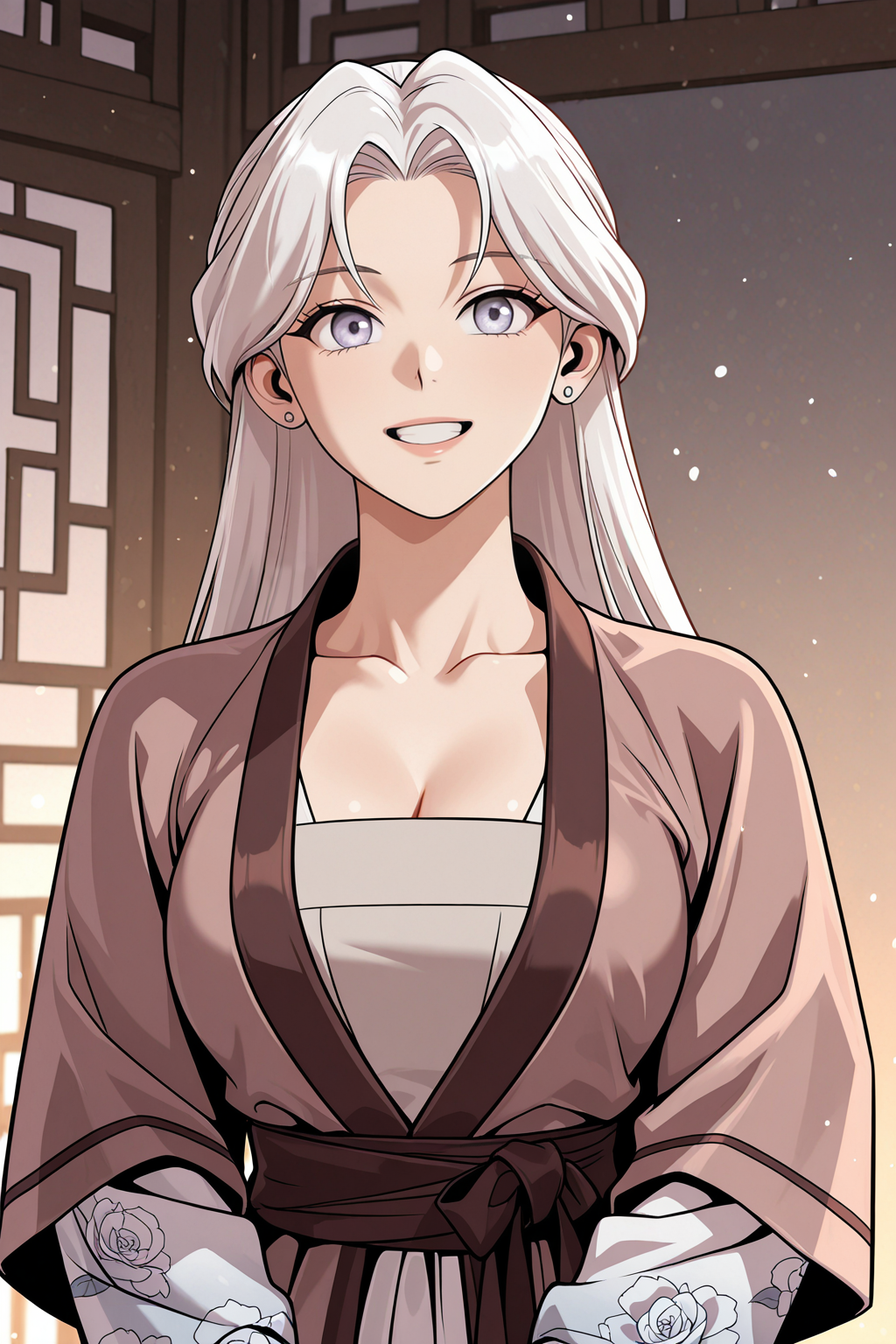 트리거: YeoSangRin, 긴 머리, 흰 머리, 중간 갈라진 앞머리, 회색 눈, 귀걸이, 로브, 드레스, 가슴선, 긴 소매, 꽃무늬, 띠