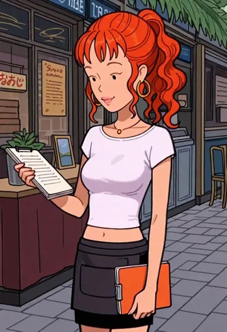 | 训练词汇 | 1girl, solo, QuinnM, red hair, long hair, bangs, lips, dot eyes, breasts, 已复制! pink crop top, elbow-length sleeves, crop top, yellow butterfly crop top graphic, midriff, blue bell-bottoms, 已复制! black ankle boots, 已复制! red hair, wavy ponytail, fringe locks, wavy locks, bangs, 已复制! hoop earrings, necklace, white crop top, short sleeves, crop top, midriff, black skirt, belt apron, waitress uniform, 已复制! red hair, hair up, hair bun, bangs, 已复制! earrings, purple neck scarf, purple blouse, blue spots on blouse and scarf, elbow-length sleeves, navy skirt, 已复制! |
