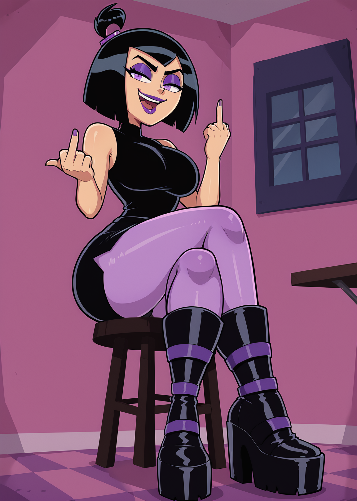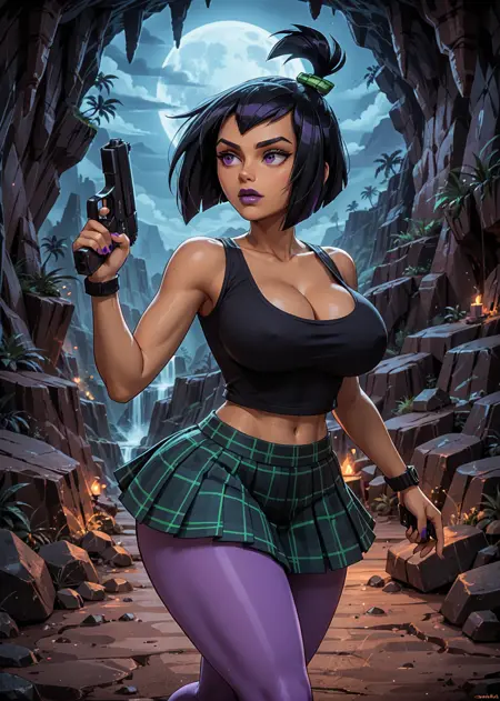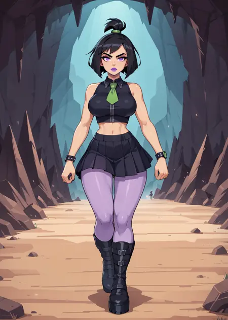 트리거 단어: 1girl, solo, 검은 머리, 고트, 보라색 립스틱, 아이섀도우, 높은 토끼꼬리, 짧은 머리, 갈색 피부, 검은 셔츠, 소매 없음, 허리 부분, 체크 무늬 치마, 연보라색 팬티스타킹, 검은 플랫폼 부츠, 회색 밑창
