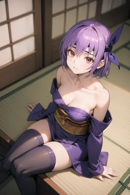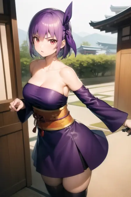 - Purple dress: ayanedef, strapless dress, obi, bare shoulders, purple detached sleeves, purple thighhighs, japanese clothes, purple dress, red back bow