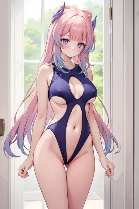 触发词:蓝色连体泳衣、腹部、胸线镂空、服装镂空、下胸围镂空