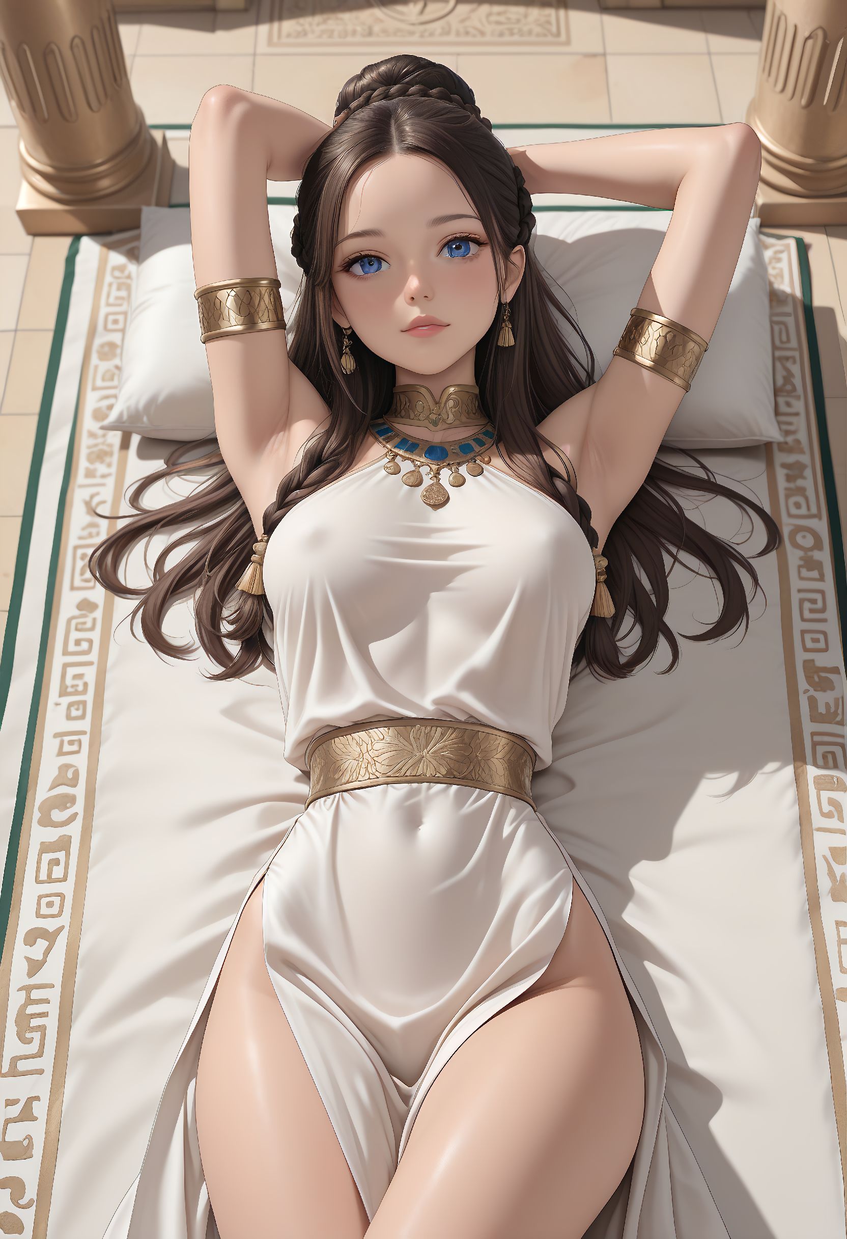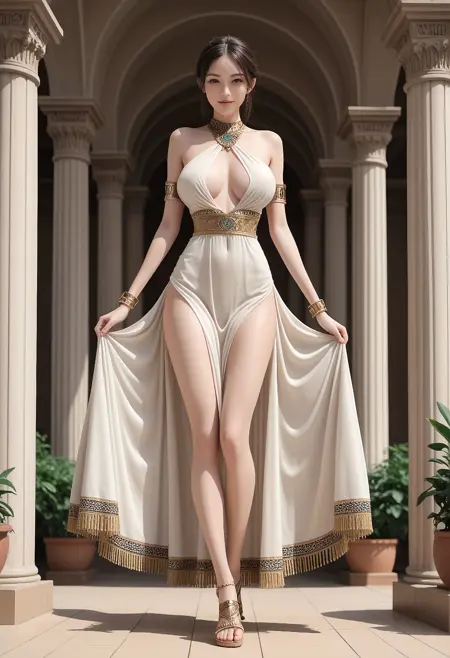 d032, white linen wrap top, gold embroidered falcon motif, white long slit skirt with beaded fringe, gold armbands, sandals with carved hieroglyphic soles,