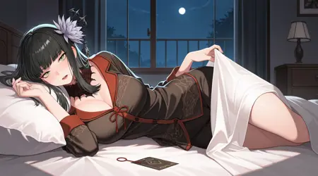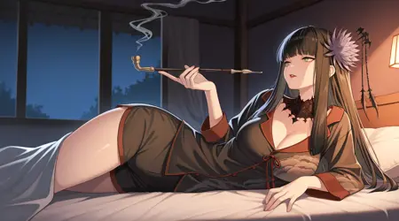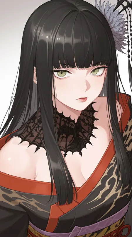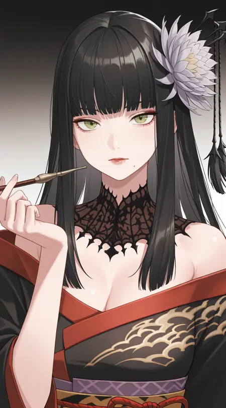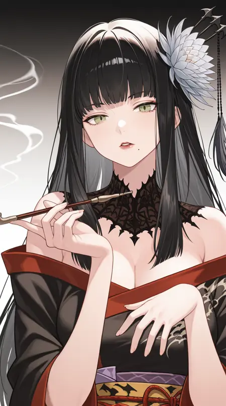 基本提示:yotsuyu_ff14, (mole_under_mouth:0.7), hair_flower, black_kimono,