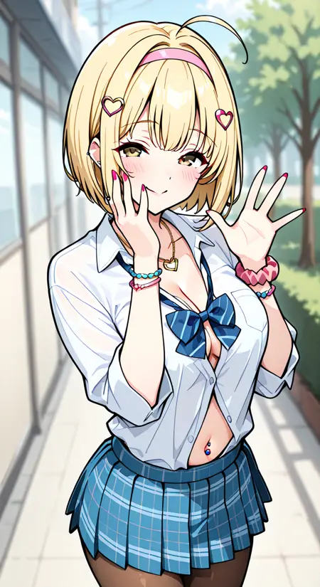 1girl, kogal, blonde bob_cut, ahoge, pink hairband, heart hair ornament, pierced navel, heart necklace, scrunchie bracelets,