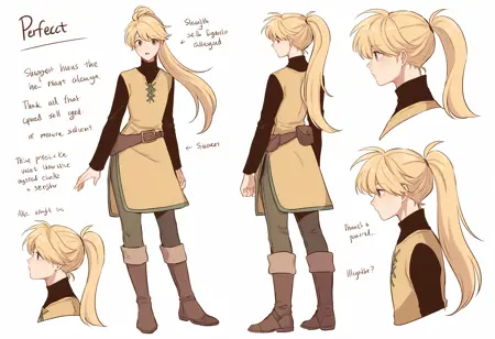 クラシックな衣装: 長い髪、ポニーテール、チュニック、長袖、ドレス、ベルト、ズボン、ブーツ