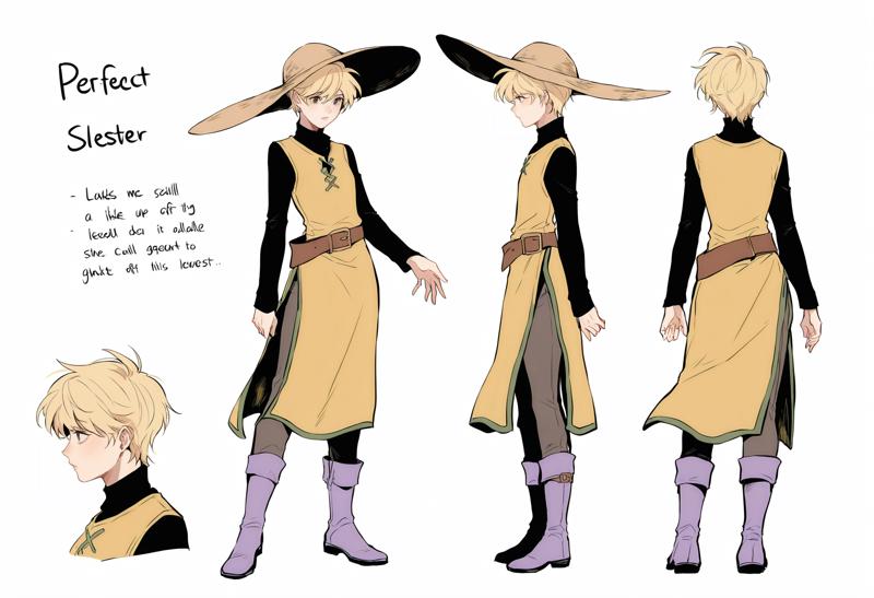 クラシックな衣装(隠された正体): 短い髪、帽子、わら帽子、茶色い頭部装備、シャツ、下着、黒いシャツ、チュニック、タートルネック、長袖、タバード、ベルト、茶色いベルト、バックル、ベルトのバックル、ズボン、ブーツ、紫色の足元