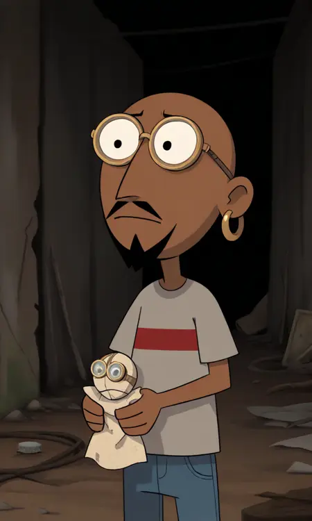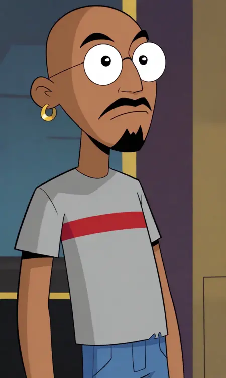 1boy, dark-skinned male,bald, single gold hoop earring, black eyes, goatee, moustache, beard, round eyewear, glasses, T-shirt, grey shirt, single red stripe on his shirt,short sleeves, blue pants, jeans