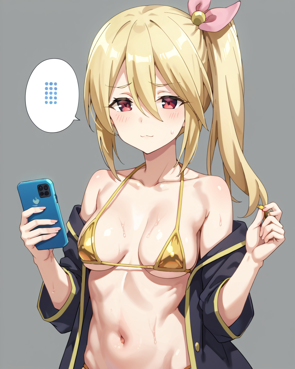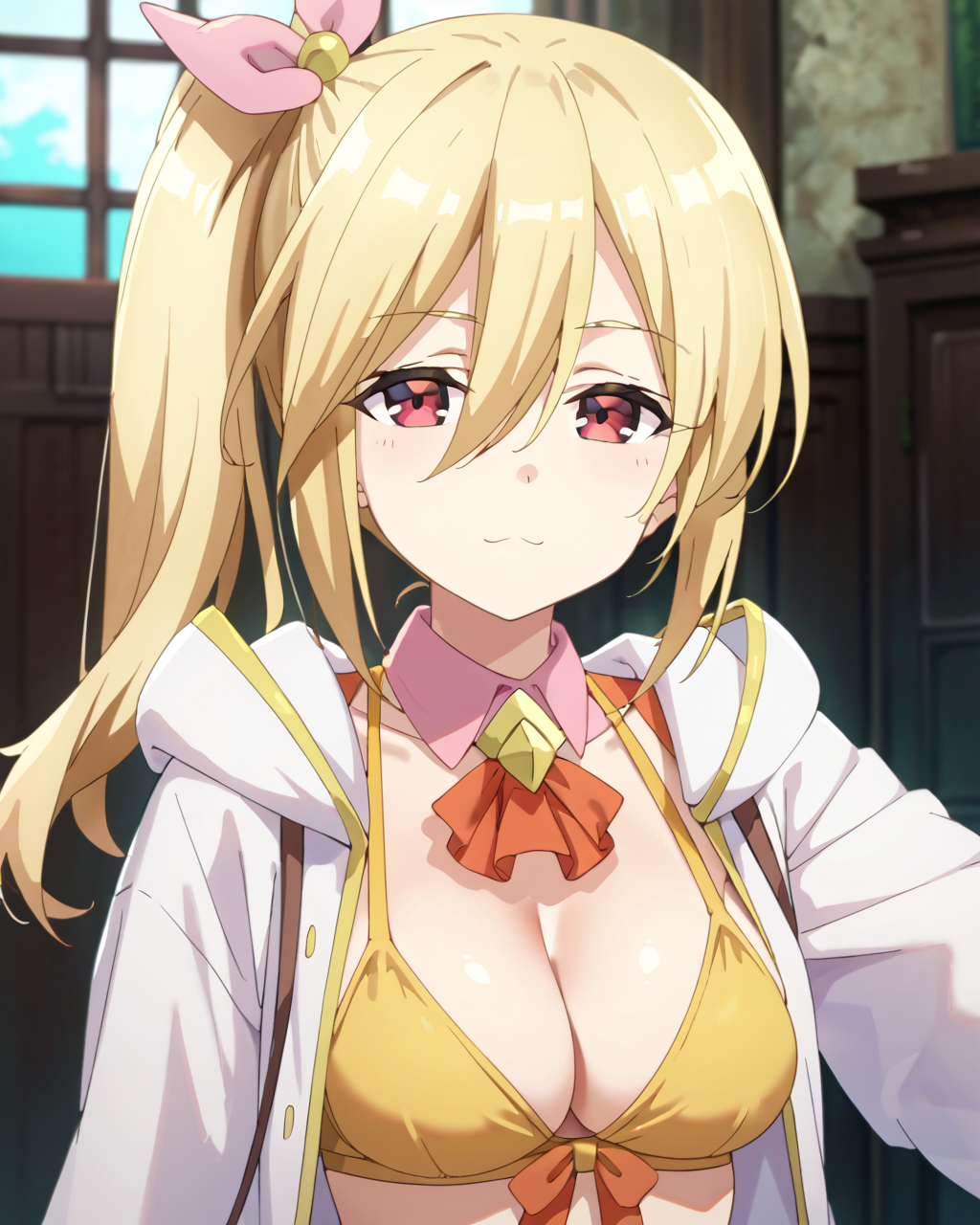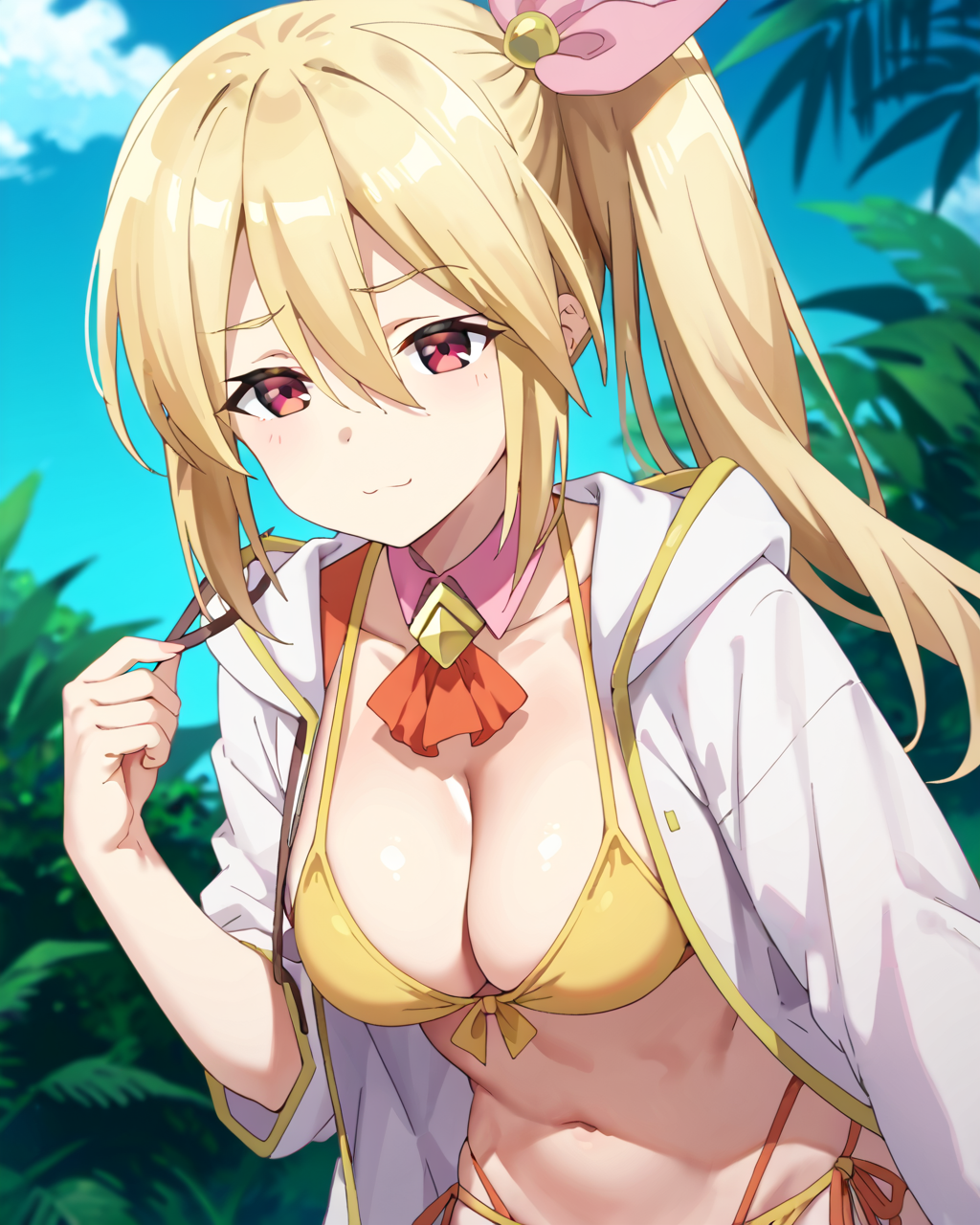 弗雷德里卡,金色头发,红褐色眼睛,长发,马尾,侧马尾,1个女孩,独照,胸部,黄色比基尼,乳沟,侧系式比基尼下装,丝带