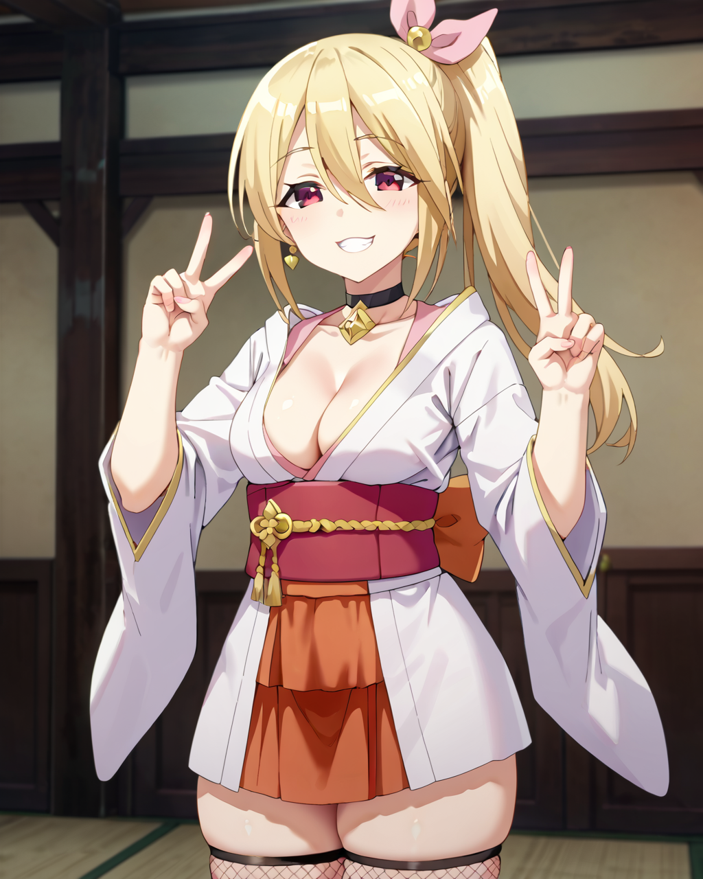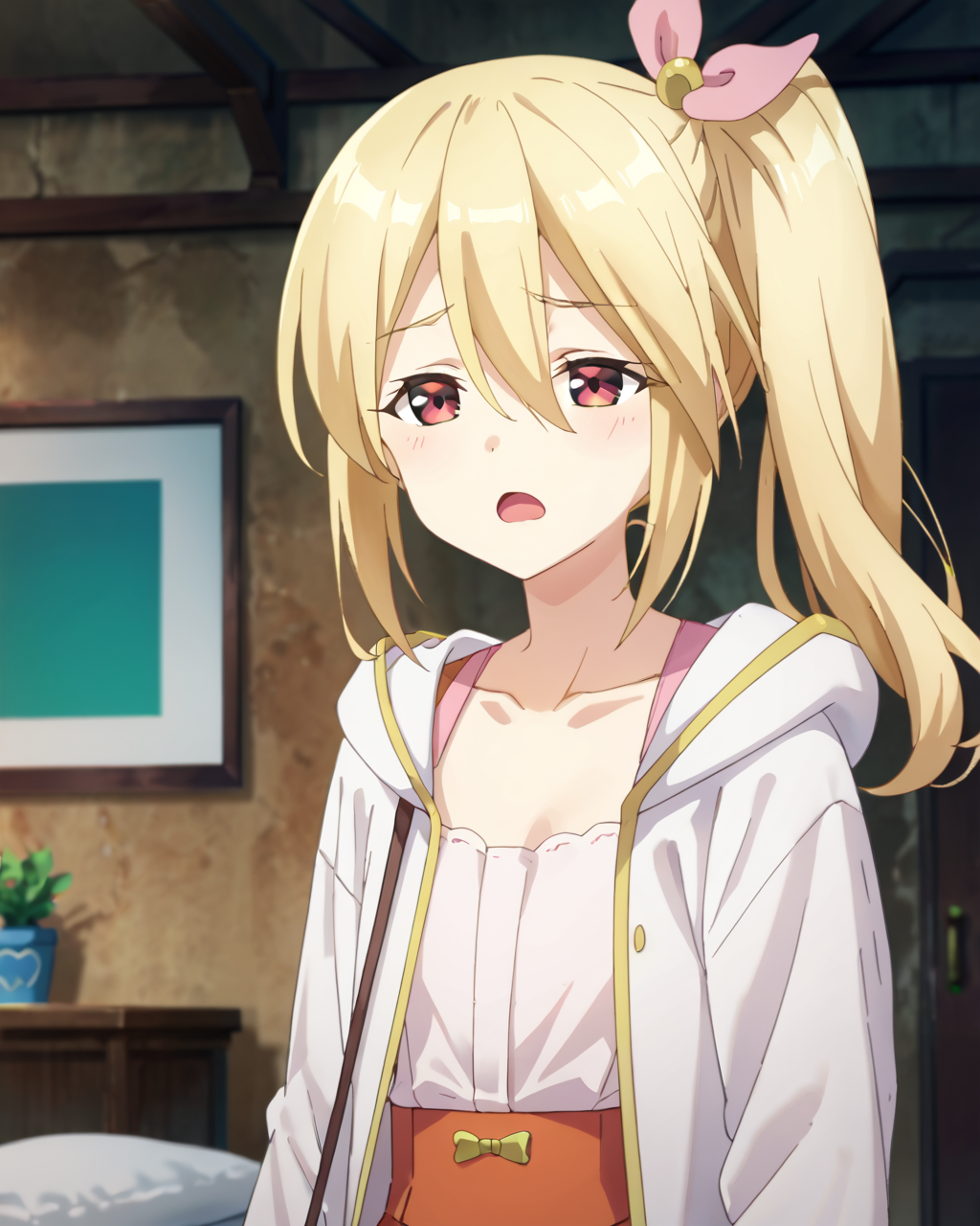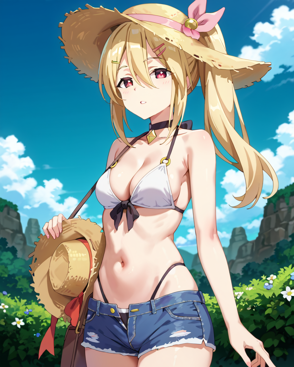 弗雷德里卡,金色头发,红褐色眼睛,长发,马尾,侧马尾,1个女孩,独照,胸部,黄色比基尼,乳沟,侧系式比基尼下装,丝带