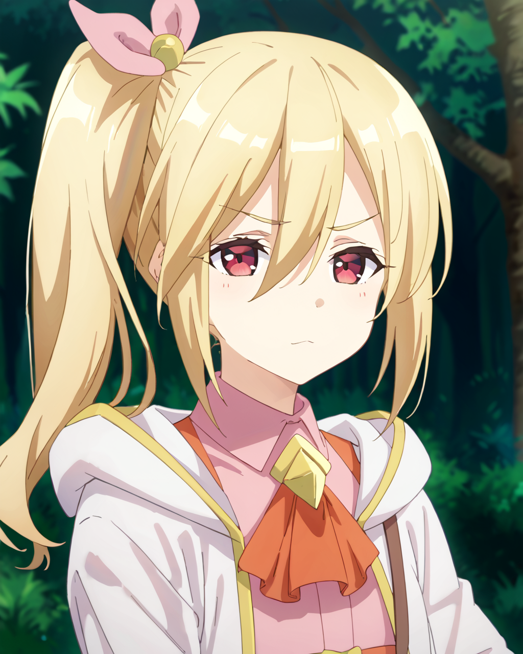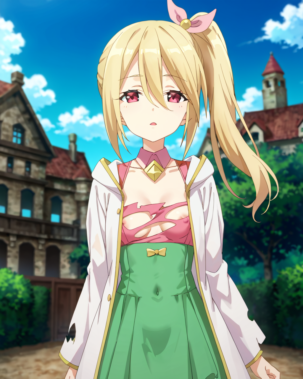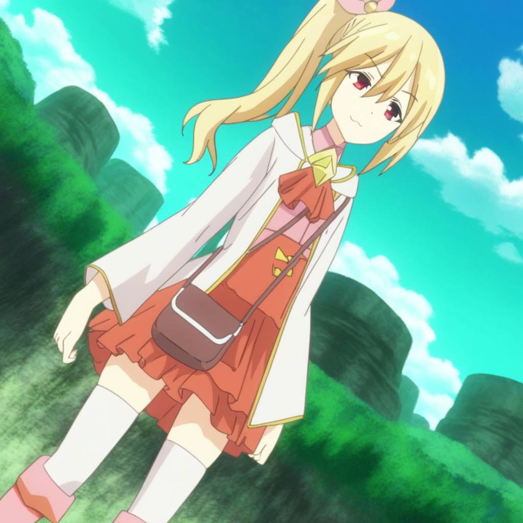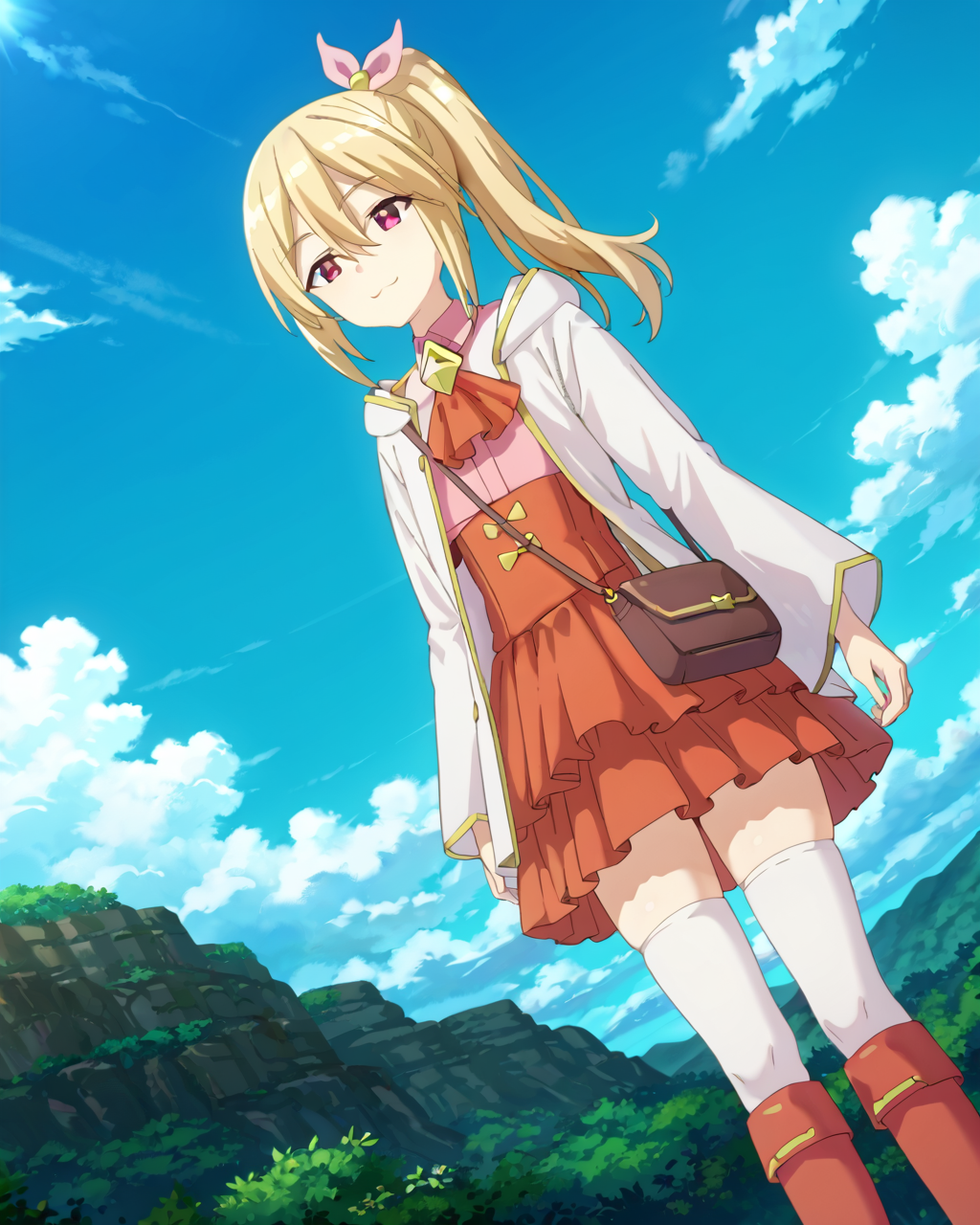 弗雷德里卡,金色头发,红褐色眼睛,长发,马尾,侧马尾,1个女孩,独照,过膝袜,靴子,白天,户外,云,天空,白色过膝袜,包包,裙子,红眼睛,微笑,绝对领域,发带,领结,丝带,荷兰角,蓝天,红色裙子,站立,手提包,长袖