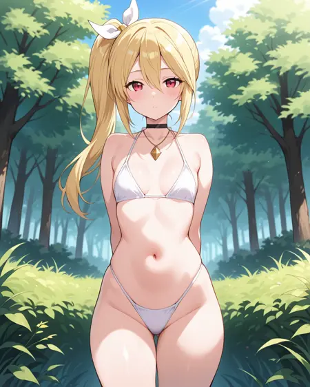 フリデリカ、金髪、赤みがかった目、長い髪、ポニーテール、サイドポニーテール、1girl、単体、胸、黄色いビキニ、乳首、サイドタイ式ビキニパンツ、リボン