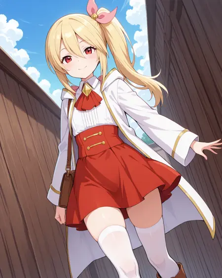 フリデリカ、金髪、赤みがかった目、長い髪、ポニーテール、サイドポニーテール、1girl、単体、太ももハイソックス、ブーツ、日中、屋外、雲、空、白い太ももハイソックス、バッグ、スカート、赤い目、笑顔、絶対領域、髪リボン、アスコット、リボン、オランダ角、青空、赤いスカート、立っている、ハンドバッグ、長袖