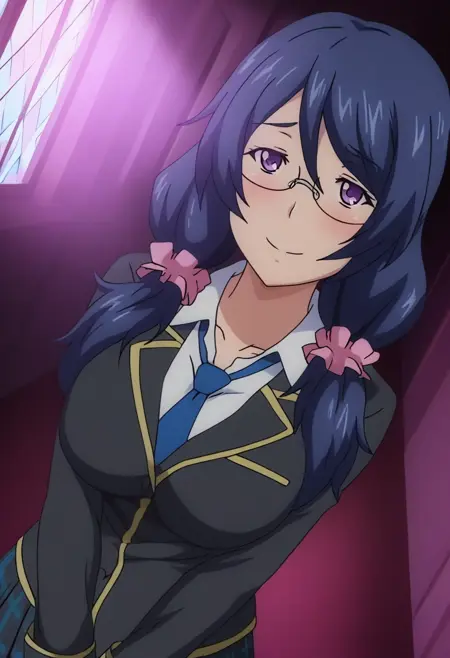 tadokoro aoi, 1girl, blue hair, black hair, long hair, twintails, scrunchie, glasses, purple eyes, large breasts, school uniform, shirt, skirt, long sleeves, black blazer