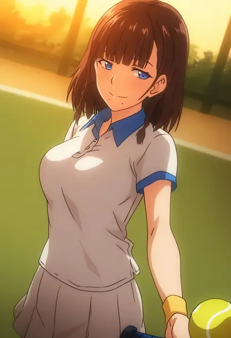 ijuuin maya, 1girl, solo, brown hair, short hair, bangs, braid, twin braids, side braid, blue eyes, mole, mole under mouth, tennis uniform, sportswear, skirt, shirt, wristband, tennis racket, racket, tennis ball