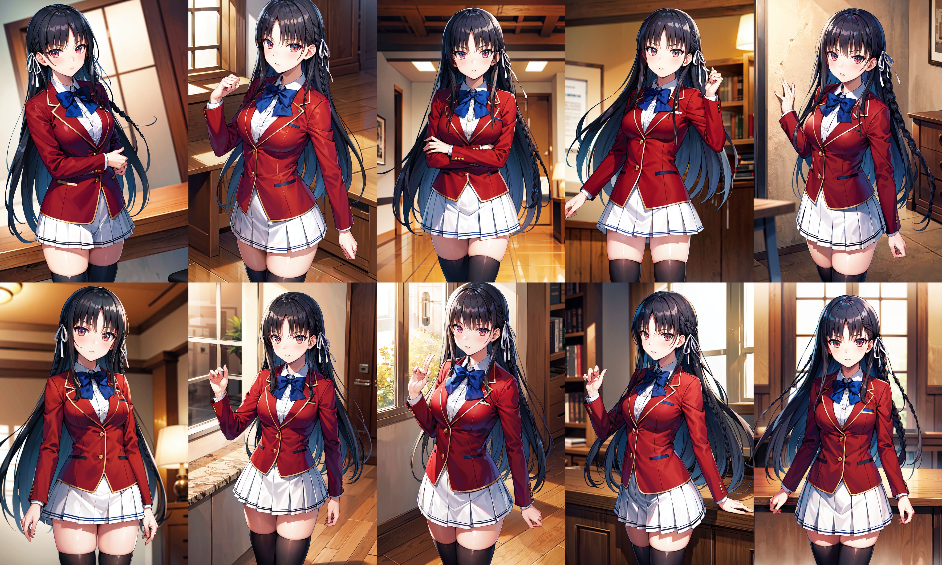 아우트핏1aasuzune, 긴 머리, 검은 머리, (단일 머리끈:1.2), 머리 띠, 빨간 재킷, 블레이저, 파란 리본넥타이, 긴 소매, 흰 치마, 검은 허벅지양말