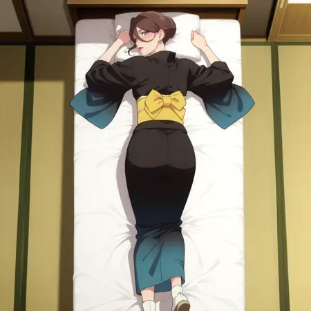 YumikaBlKi,单发髻,口红,妆容,耳环,日本服饰,黑色和服,黄色腰带,